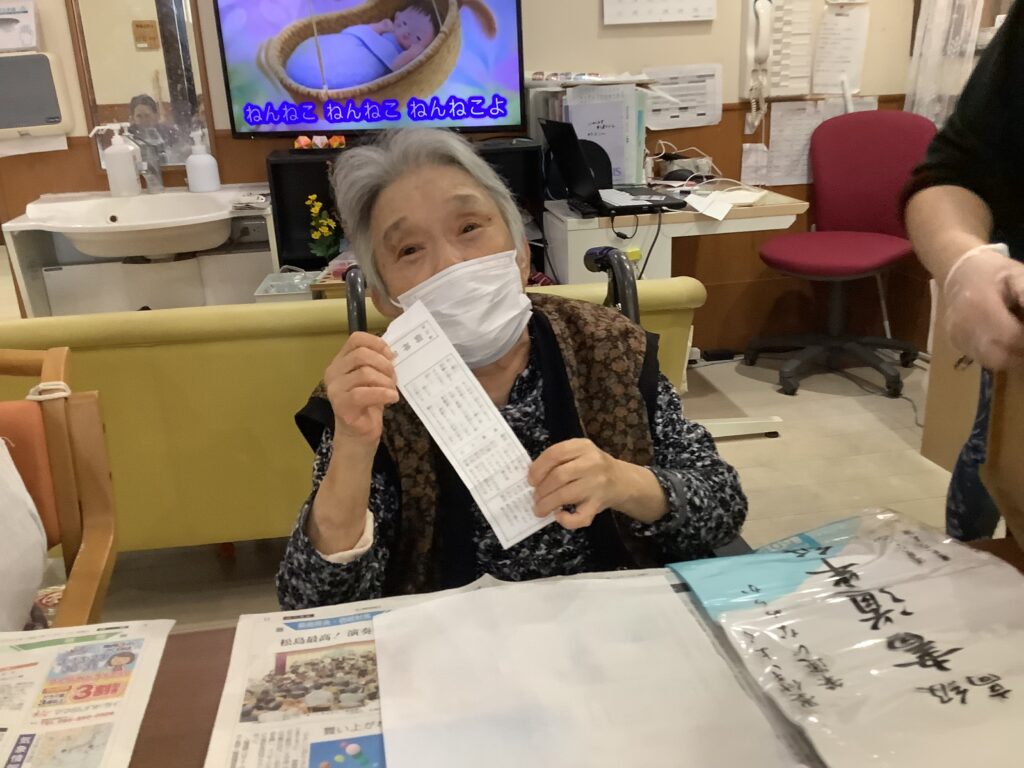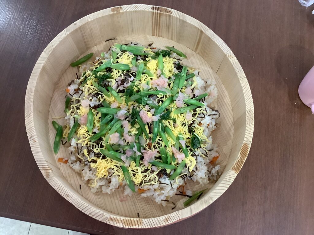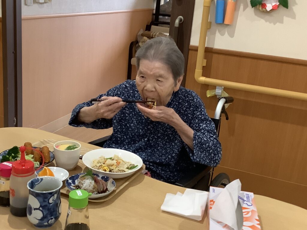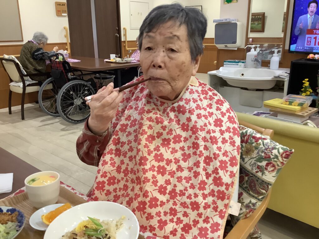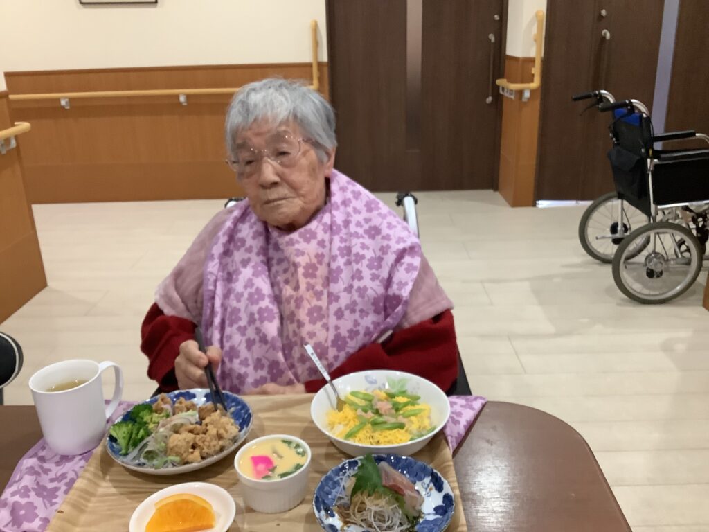 他の入居者さんとお話をされながら、『この刺身は歯ごたえがあって美味しい~』、『ちらし寿司が美味しか~』、などと好評でした。