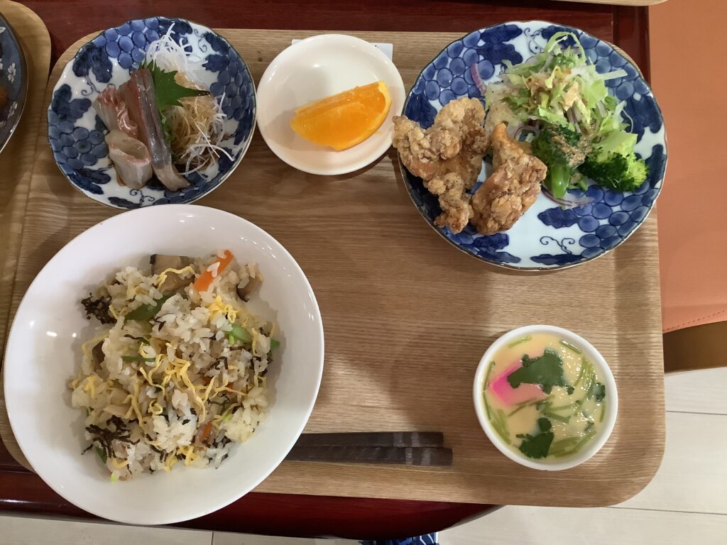 1月12日の昼食はちらし寿司、鶏のから揚げ、刺身の盛り合わせ、茶碗蒸し、オレンジと豪華なメニューです。