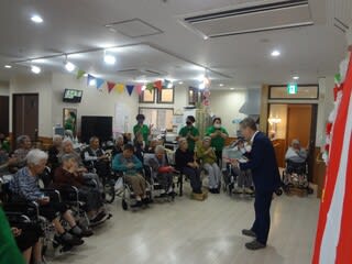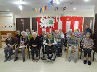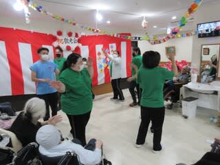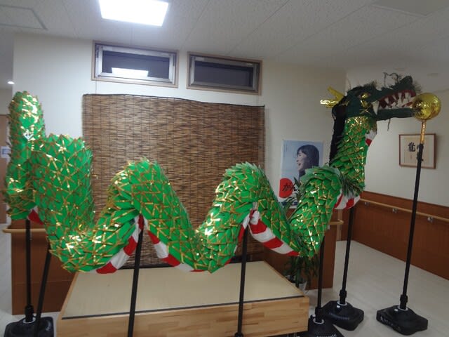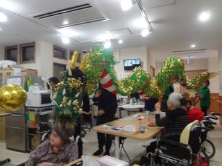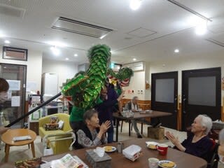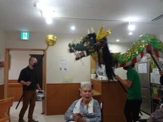 午後からは施設内行事で初となる職員による龍踊を行いました。職員の息を合わせた掛け声と龍の動きで、全ユニットを回りました