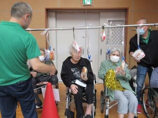 パン喰い競争では入居者さん全員参加されました。さて皆さん狙ったパンは取れたでしょうか?