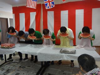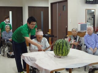 スイカ割りのあとは、職員によるスイカの早食いがあり、皆さんお腹を抱えて笑われていました