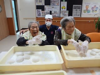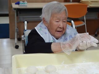 入居者の皆さんには、つきたての餅を丸めてもらいました