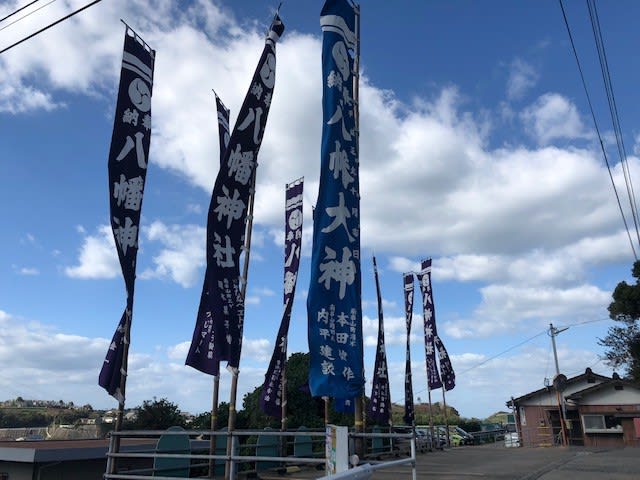 10月29日と30日は八幡神社大祭です。 昨日(26日)は当前地区による、しめ縄と男性職員による旗立ても行われました。