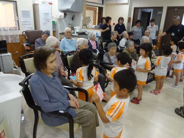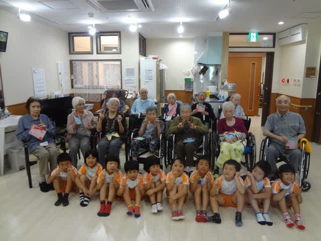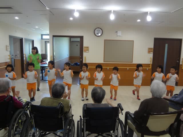 八幡保育園の園児達が敬老のお祝いで来てくれました。歌ったり踊ったりしている園児の可愛い姿を見られ、皆さん大変楽しまれました(^^)