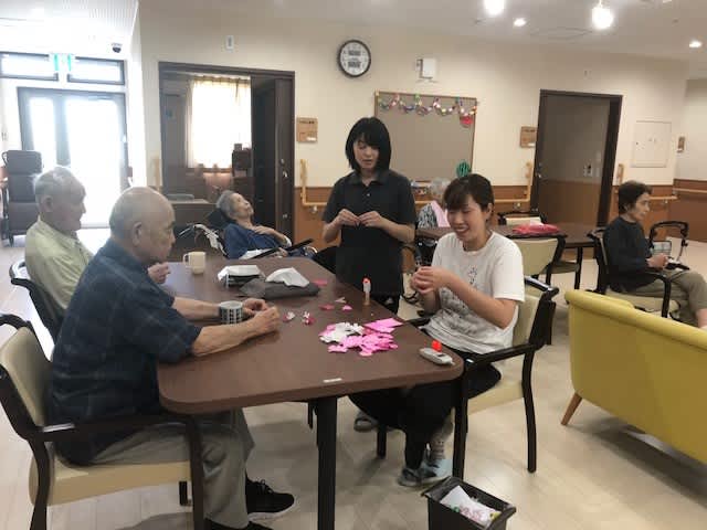 折り紙で花びら作りをしています! 男性利用者の皆様に開く作業をして頂きました