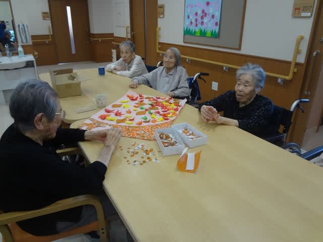 つるがおかユニットでは、折り紙貼り絵を行われてました。 行われない利用者さんも作品を見ながら笑顔で話されてました。