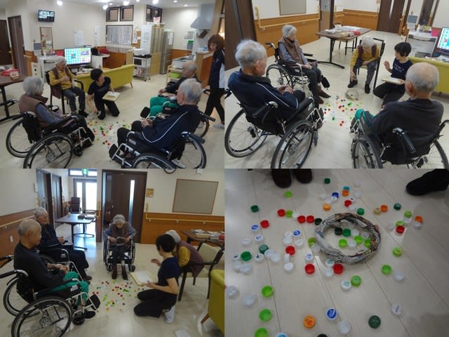 いわしみずユニットでは,、輪投げして ペットボトルの蓋を輪の中に何個入れきれるか! を競うゲームを行われていました。 笑いが多く大変盛り上がってました(^o^)